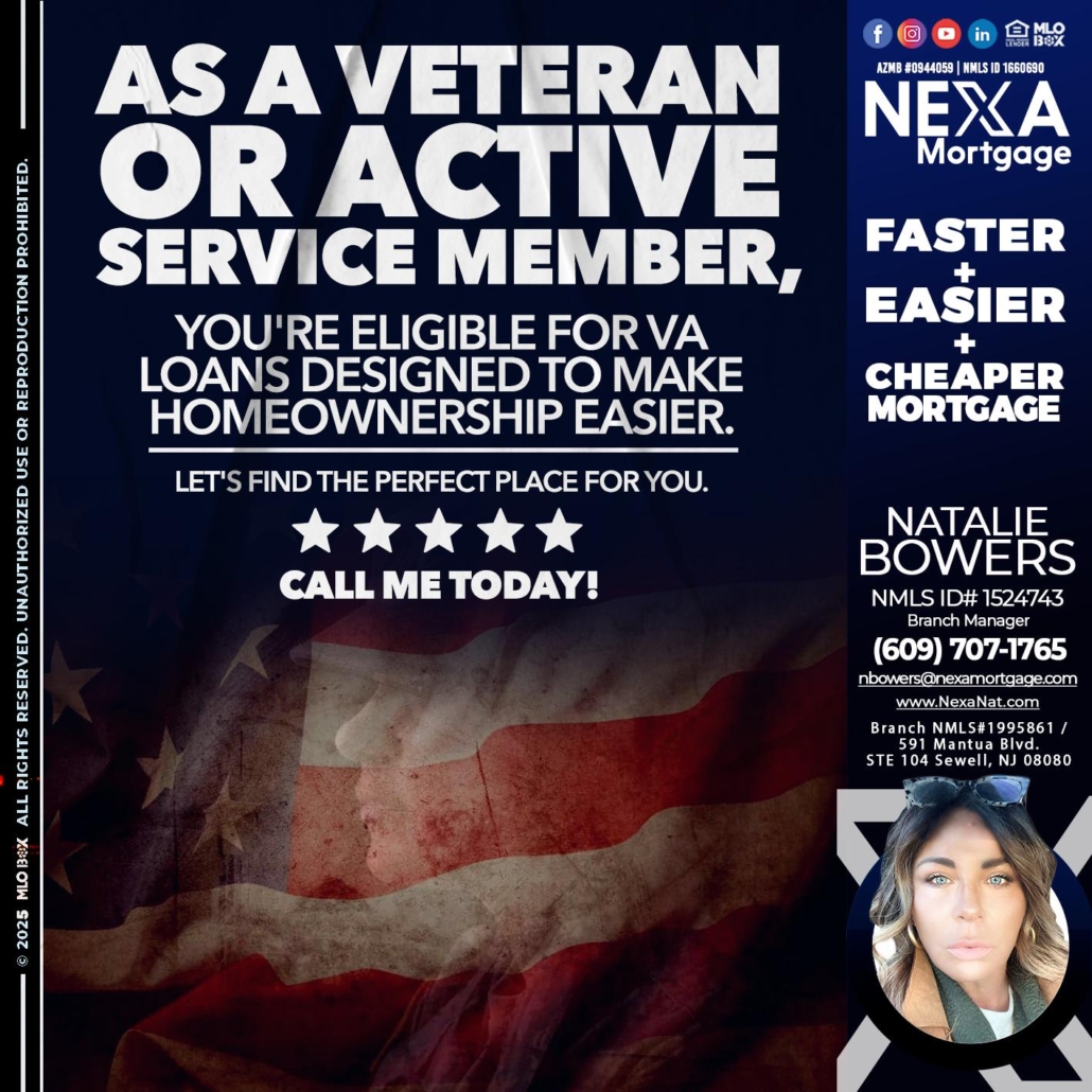 AS A VETERAN MEMBER - Natalie Bowers -Branch ManagerHi, my name is Natalie Bowers. I’m a Loan Officer with NEXA Mortgage LLC., offering personalized mortgage solutions, fast customized quotes, great rates and service with integrity.
